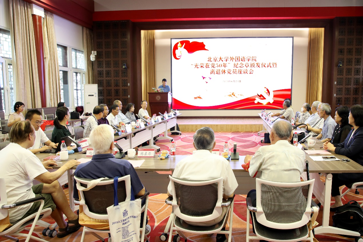 2023年6月23日上午,开云官方网页版“光荣在党50年”纪念章颁发仪式暨离退休党员座谈会在民主楼208多功能厅举行。北京大学主题教育第三指导组组长关海庭、开云官方网页版党委书记李淑静和党政领导班子成员以及获颁纪念章党员、老党员代表、劳模代表、离退休党支部书记和支部委员等20余人参加了活动。