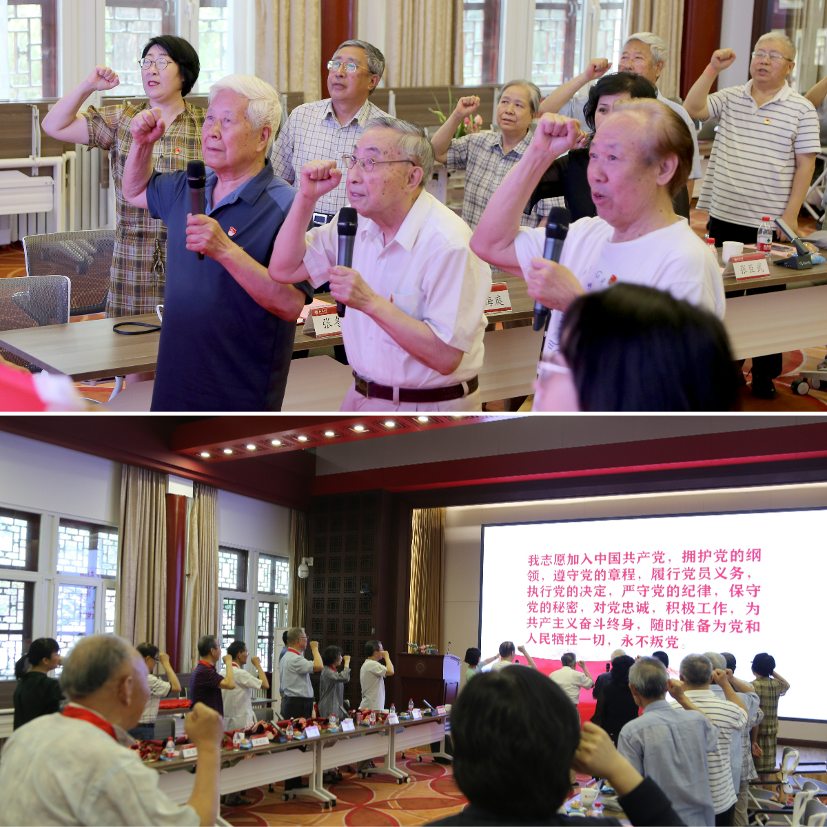 2021年首批“光荣在党50年”纪念章获得者胡壮麟教授、陈嘉厚教授、赵振江教授带领在场党员同志重温入党誓词。全体老党员面向党旗,高举右手,铿锵有力的宣誓充分体现了离退休党员离岗不离党、退休不褪色的精神面貌。