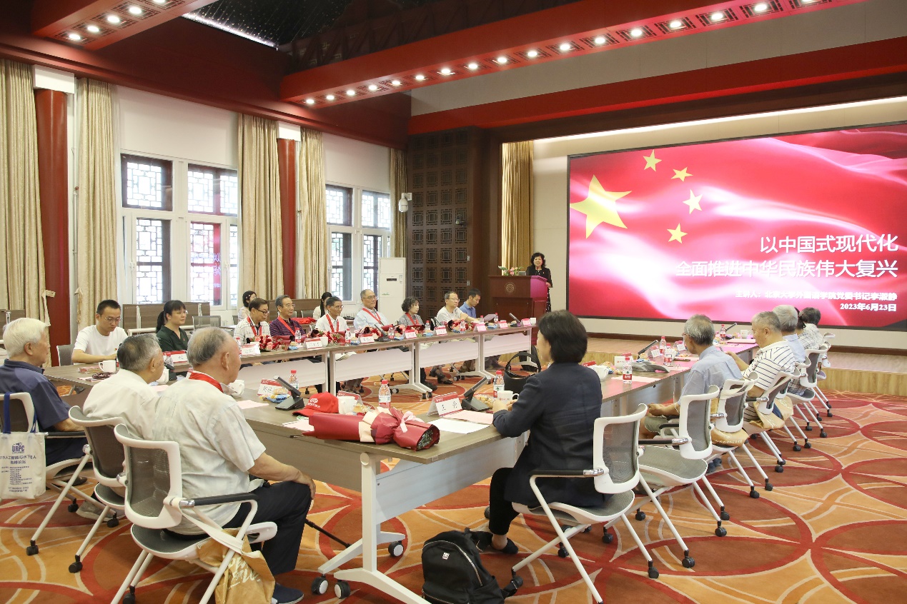 党委委员、副院长王丹和党委副书记王恒分别从课程思政建设和学生工作角度,向离退休党员教师汇报近年来外院育人工作方面采取的措施和取得的成效。