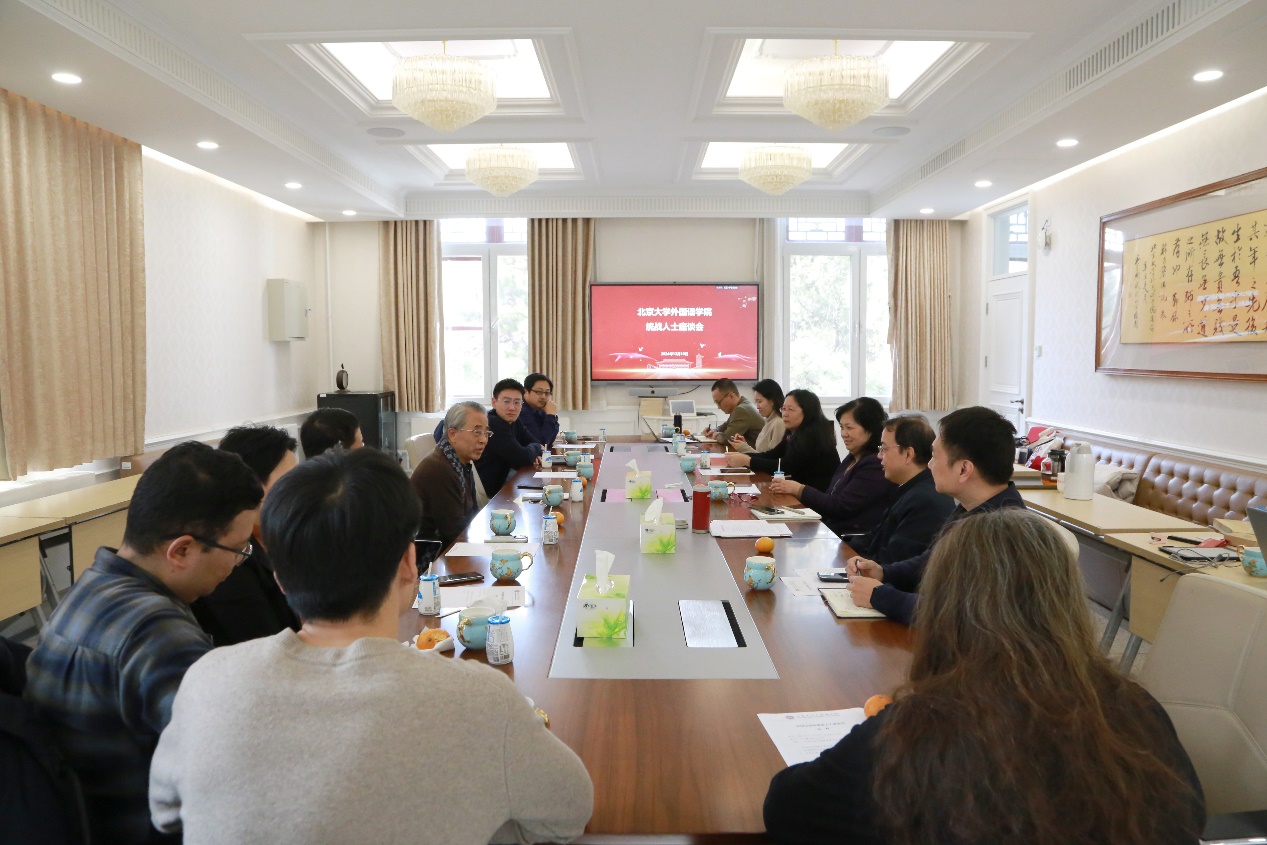 随后,院领导班子与统战人士代表进行亲切交谈。代表们纷纷发言,各抒己见,就教学科研、人才培养、教师队伍建设等方面提出了宝贵的意见和建议。九三学社社员、西亚系教授拱玉书表示,自己虽已退休但仍笔耕不辍,分享了自己在冷门绝学研究领域的探索与成果,并呼吁更多年轻人投身于此,共同推动古代文明研究和文献翻译事业的发展。致公党党员、东南亚系助理教授谢侃侃认同翻译的重要性,同时也就学院如何助力青年教师成长提出建议。与会代表们立足自身岗位对外院与外语学科的发展进行了深入思考,展现出高度的责任感和使命感。