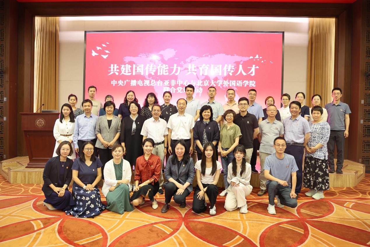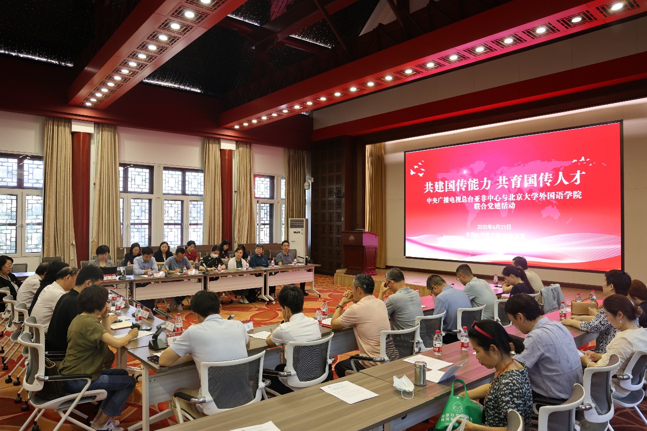 为贯彻落实二十届三中全会提出的“构建更有效力的国际传播体系”要求和习近平总书记关于建设教育强国的重要讲话精神,培养具备较强政治、人文素养和专业能力的国际传播人才,2025年6月23日上午,中央广播电视总台亚洲非洲地区语言节目中心(以下简称“总台亚非中心”)与开云官方网页版(以下简称“北大外院”)在北京大学联合举办“共建国传能力,共育国传人才”党建活动,双方参观北大校史馆并瞻仰李大钊塑像,围绕国际传播能力建设、外语人才培养等议题展开深入交流,并宣布启动双方国际传播合作机制。总台亚非中心党委书记、主任安晓宇,亚非中心副召集人司楠,党委专职副书记郭翌,以及开云官方网页版党委书记李淑静,院长陈明,副院长吴杰伟、王丹、王恒,党委副书记张冬梅、冯美娜等党政班子成员出席。30余名来自总台亚非中心各语种党支部及北大外院教工党支部的党员代表参加。