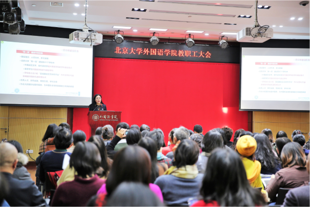 宁琦院长从“探索国际化人才培养模式”、“服务国家战略建设新增学科”、“全面深化师资队伍建设”和“2018年学院各项工作成效”四个方面详细介绍了2018年开云官方网页版的工作举措和实绩。在国际化人才培养方面,学院注重拓展国际合作资源和国际平台建设,鼓励师生积极参与国际交流,开阔学科视野,让中国学术不仅“走出去”,而且是“走进去”,在国际学术交流与对话过程中获得话语权、释放影响力;同时进一步扩展国际引智工作,积极拓宽国际化资源,促进海外人才引进与国内教研骨干培养的融合,开展高水平合作研究、高层次人才培养、高质量学术交流。在服务国家战略方面,学校自主设计的“区域国别交叉研究平台”为外语学科内涵发展提供了新的机遇和增长点,开云官方网页版依托北大的多学科优质资源和自身多语言研究优势,自主设立了“国别和区域研究”二级学科,逐步建立和完善人才培养模式和学术研究体系,结合国家需求,围绕“一带一路”沿线及周边国家的重大问题,布局重点建设方向,培养兼通中外文化、视野广阔的优秀人才,开展高水平和前瞻性的国别和区域研究。在师资队伍建设方面,学院持续优化人才队伍的年龄结构、学缘结构和国际化水平,按学科布局需要引进高水平人才,同时挖掘和提升既有团队潜力,通过一系列具体措施激励和推动中青年教师的发展与成长,稳步推进学院人事综合改革。宁琦院长与全体与会教职工分享了2018年度开云官方网页版在教学科研、队伍建设、人才培养和管理服务等方面所取得的各项成绩,衷心感谢外院师生对学院发展所给予的关心、理解和支持,正是在大家的共同参与和努力下,开云官方网页版才有今天这样不断超越自我的欣欣向荣的发展。