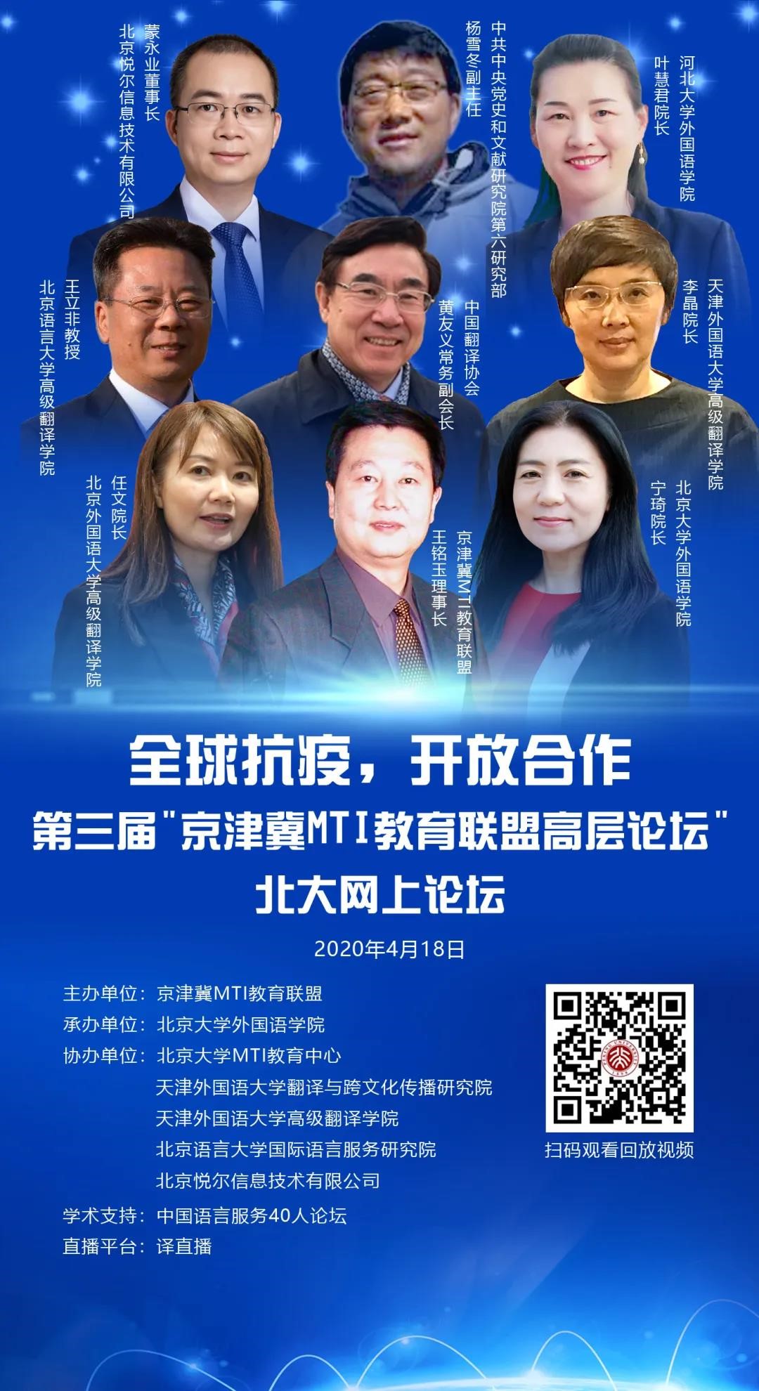 4月18日,以“全面凝聚抗疫合力,加强京津冀语言服务合作”为主题的第三届“京津冀MTI教育联盟高层论坛”北京大学网上论坛成功举行。本次论坛由京津冀MTI教育联盟主办,开云官方网页版承办,北京大学MTI教育中心、天津外国语大学翻译与跨文化传播研究院、天津外国语大学高级翻译学院、北京语言大学国际语言服务研究院、北京悦尔信息技术有限公司共同协办。中国语言服务40人论坛提供学术支持,新华网、人民网、光明网、新浪网、凤凰网、中国网等提供媒体支持,论坛译直播平台同步直播。共有来自145个机构的202名人员报名参会,其中来自境内高校178人,境外高校5人,翻译行业15人,其他机构4人。译直播平台有14442人收看同步直播。