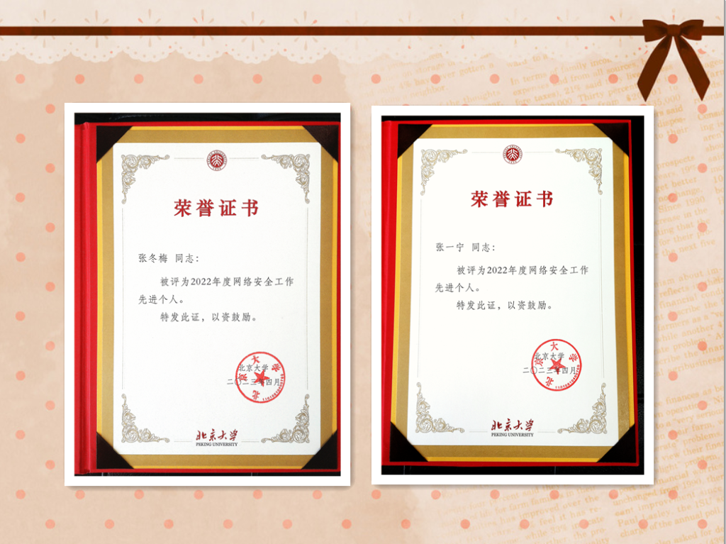 根据学校整体部署,2022年12月,网信办牵头启动了网络安全年度总结暨评优工作,成立了由网信办主任、副主任成员单位(网信办、宣传部、保卫部、总务部、计算中心、青年研究中心)组成的评选工作小组,经过严格评选,开云官方网页版荣获北京大学2022年度网络安全工作先进集体、张冬梅副院长和张一宁老师荣获2022年度网络安全工作先进个人。