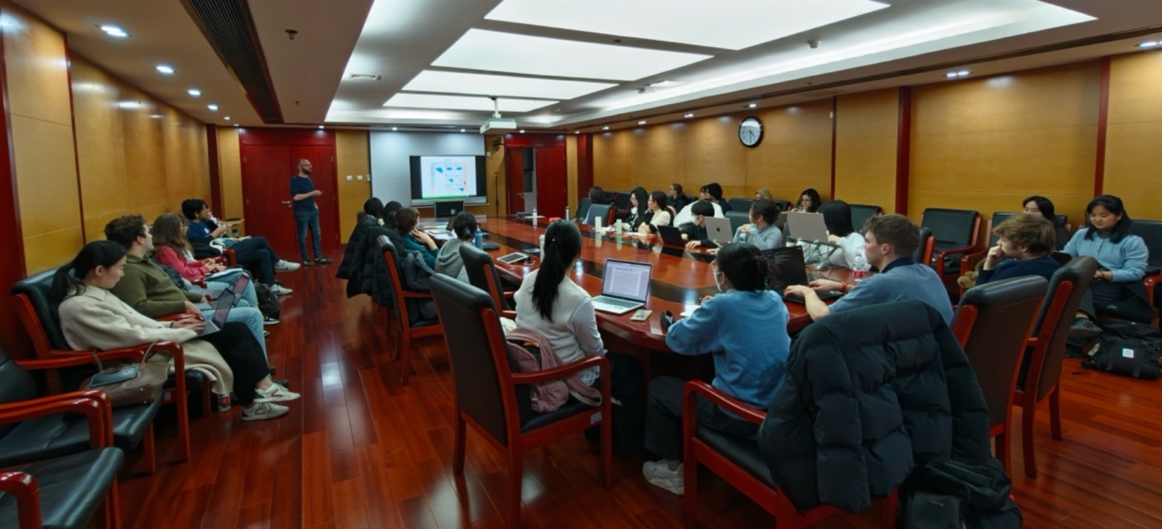 卢克·范·门塞尔副教授的讲座激发了在场学者与学生的广泛兴趣。罗正鹏老师主持了提问环节,并就宏观社会因素(如学校语言政策)如何影响家庭语言实践进行了提问。语言所师生、燕京学堂的留学生、以及北京外国语大学的学者积极参与互动,现场交流热烈。来自不同文化背景的参与者就美国移民家庭、日韩多语家庭、中国多语家庭,以及欧洲多语家庭中的语言政策和语言使用等议题展开了深入讨论。